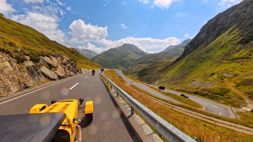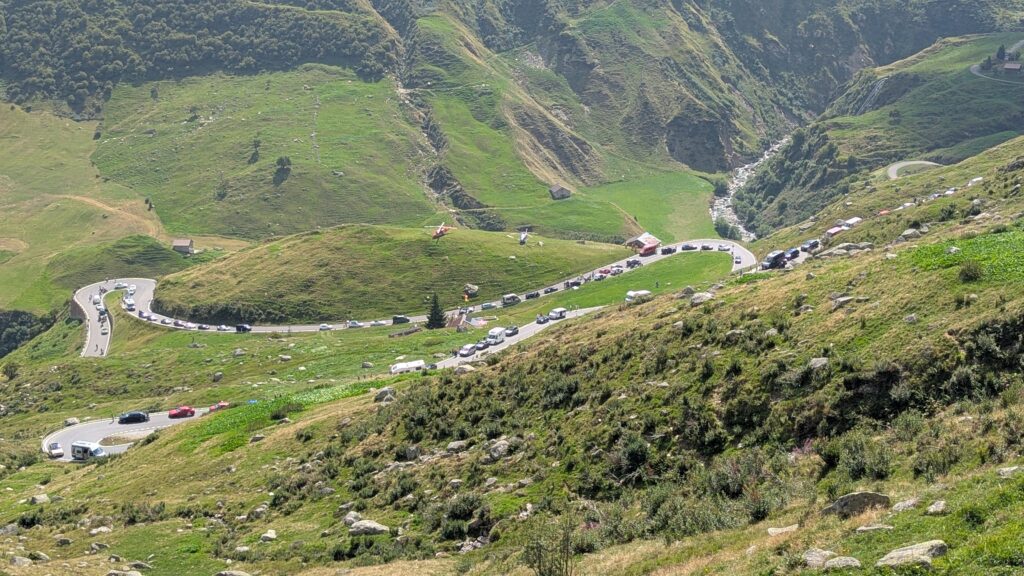 Am nächsten Morgen geht es früh in Richtung Heimat, bei herrlichem Wetter in gemütlichem Tempo durch die Alpenlandschaft. Unterbrochen durch eine unfreiwillige Pause mit Ausblick. Zwei Motorradfahrer haben sich getroffen und mussten mit dem Rettungshubschrauber die Heimreise antreten – währenddessen ist die Strasse voll gesperrt. Nach einer guten Stunde rollt der Verkehr wieder und ich lege die letzten Meter gelassen zurück.