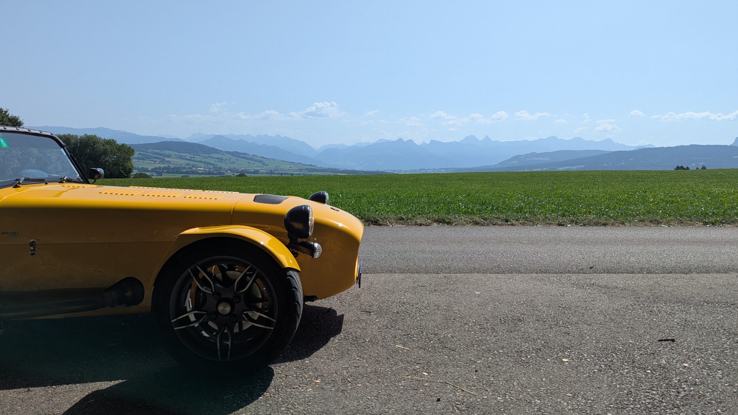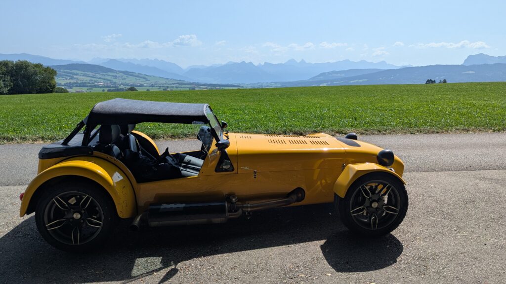Die Heimreise ist aber sowieso etwas ausführlicher geplant. Zunächst geht es auf französischer Seite in Richtung Süden. Dann durchs Jura und mit einigen schönen Umwegen bis zum Genfersee zu einem Mittagessen bei Freunden. Da der Heimweg mich über Furka & Co führen soll, übernachte ich noch gediegen im Berner Oberland. Vor einem ausgezeichneten Abendessen mit regionalen Produkten nutze ich noch die SPA Landschaft des Hotels zur Entspannung. Der Caterham schläft derweilen in der Garage in nobler britischer Nachbarschaft.